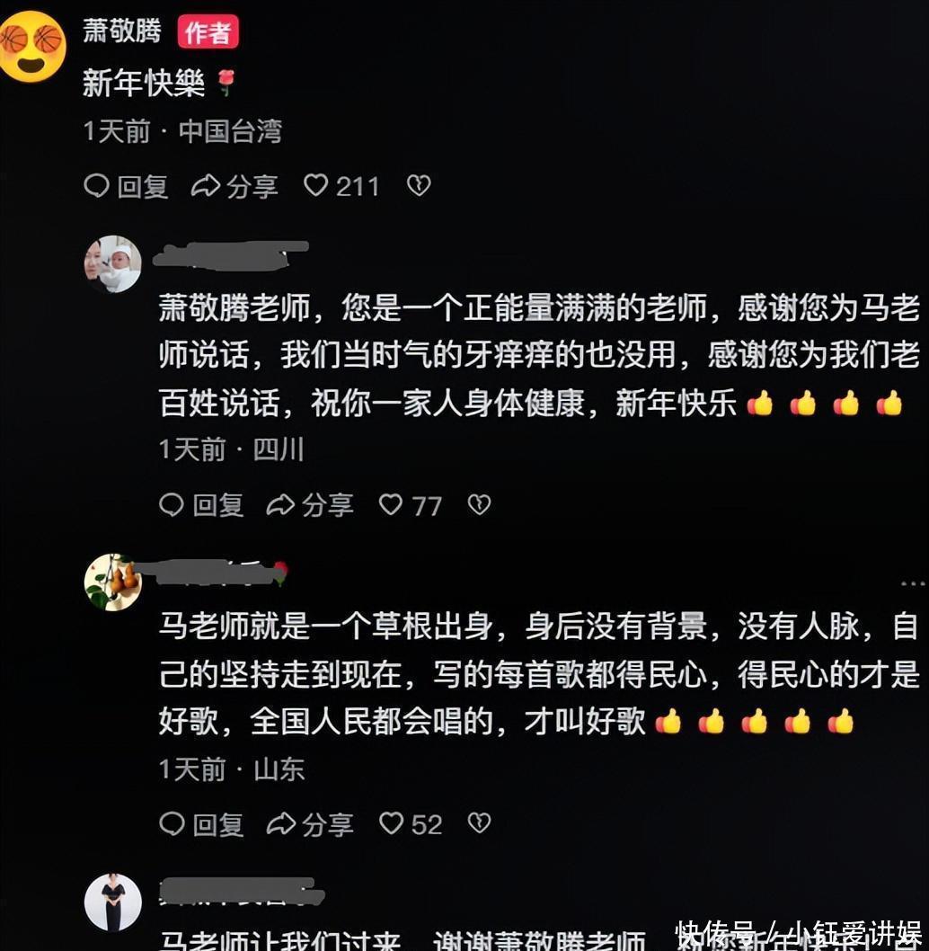 本以为节目播完就翻篇了,没想到马健涛的粉丝直接炸了锅,开启了全方位“围攻”模式。节目播出后,粉丝们纷纷涌到萧敬腾的抖音账号下,疯狂感谢他的仗义执言,还有人自报家门:“是马老师让我们过来的!”